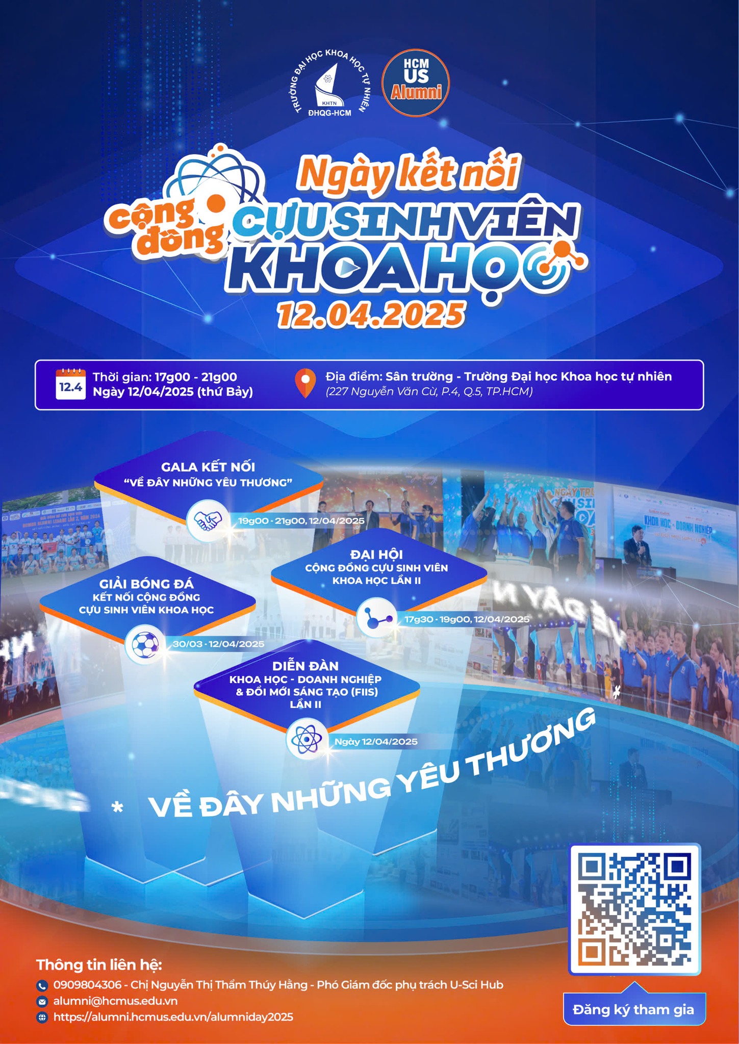 Với mong muốn kết nối và lan tỏa những giá trị truyền thống tốt đẹp, Trường Đại học Khoa học tự nhiên phối hợp cùng Ban đại diện Cộng đồng Cựu sinh viên Khoa học trân trọng tổ chức Ngày kết nối Cộng đồng Cựu sinh viên Khoa học năm 2025 (HCMUS Alumni Day 2025) và Đại hội Cộng đồng Cựu sinh viên Khoa học lần II, nhiệm kỳ 2025-2028 với chủ đề: “Về đây những yêu thương”.